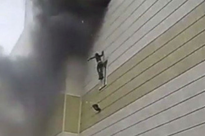 ცეცხლმოკიდებული სავაჭრო ცენტრიდან მამაკაცი გადმოხტა – რუსეთში მასშტაბურ ხანძარს ებრძვიან (ვიდეო)