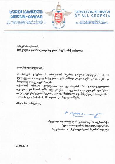 „მის აღმატებულებას, რუსეთის ფედერაციის პრეზიდენტს, ბატონ ვლადიმერ პუტინს. თქვენო აღმატებულებავ, ბატონო პრეზიდენტო! შეგვძრა კემეროვოში მომხდარმა ტრაგედიამ. მიიღეთ ჩვენი სამძიმარი. ვგლოვობთ ჩვენც და აღვავლენთ ლოცვებს, რათა უფალმა ახლად შესვენებულთა სულნი დააწესოს საყოფელსა მართალთასა, ხოლო მათ ახლობლებს მიანიჭოს მტკიცე რწმენა და ნუგეში“,- წერს უწმინდესი.