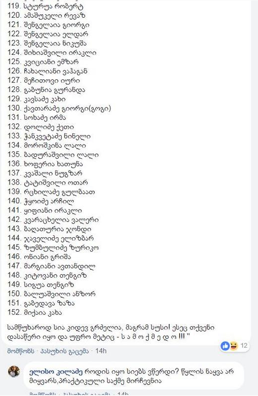 სამწუხაროდ სია კიდევ გრძელია, მაგრამ სუსი! ესეც თქვენი დასაწერი იყო და უფრო მეტიც – ს ა მ ო ქ მ ე დ ო!”, – წერს კემულარია.