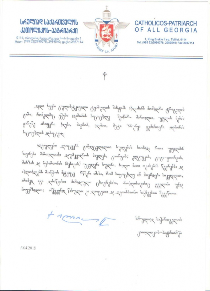 „დიდია ჩვენი გულისტკივილი ტყიბულის შახტაში ახლახან მომხდარი ტრაგედიის გამო, რომელმაც ექვსი ადამიანის სიცოცხლე შეიწირა. მართალია, უფლის ნების გარეშე არაფერი ხდება, მაგრამ ალბათ მეტი ზრუნვა გვმართებს ადამიანის სიცოცხლის დასაცავად.
