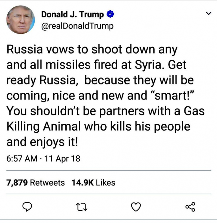 ტრამპი მიიჩნევს, რომ, სირია არ უნდა იყოს გაზით “მგუდავი მხეცის” პარტნიორი. „რუსეთი აცხადებს, რომ სირიის მიმართულებით გაშვებულ ყველა რაკეტას ჩამოაგდებს და გაანადგურებს. მოემზადე, რუსეთო, რადგან ისინი მოდიან, მშვენიერები, ახლები და „ჭკვიანები“. თქვენ არ უნდა იყოთ “გაზით მგუდავი მხეცის” პარტნიორები, რომელიც საკუთარ მოქალაქეებს ხოცავს და ეს სიამოვნებს “, – დაწერა დონალდ ტრამპმა.