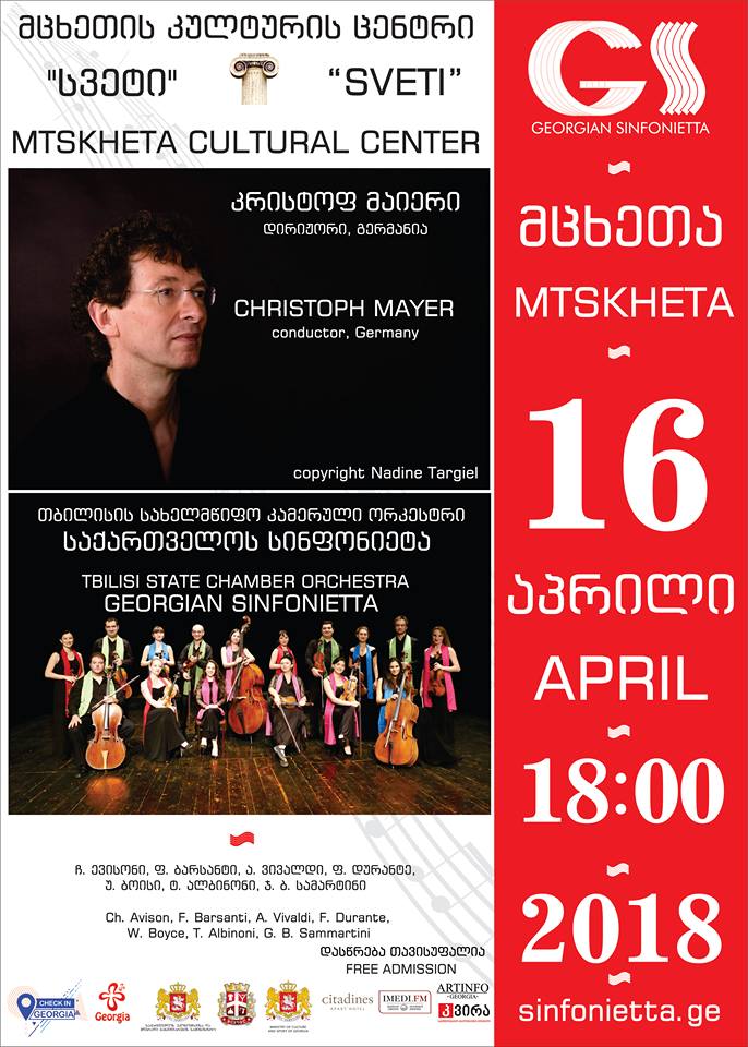 ასე რომ, 16 აპრილს, 19:30 საათზე, მცხეთის კულტურის ცენტრ „სვეტში“ „საქართველოს სინფონიეტა“ და კრისტოფ მაიერი ბაროკოს პერიოდის კომპოზიტორების: ჩ. ეივისონის, ფ. ბარსანტის, ა. ვივალდის, ფ. დურანტეს, უ. ბოისის, ტ. ალბინონისა და ჯ. ბ. სამარტინის ნაწარმოებებს შეასრულებენ.
