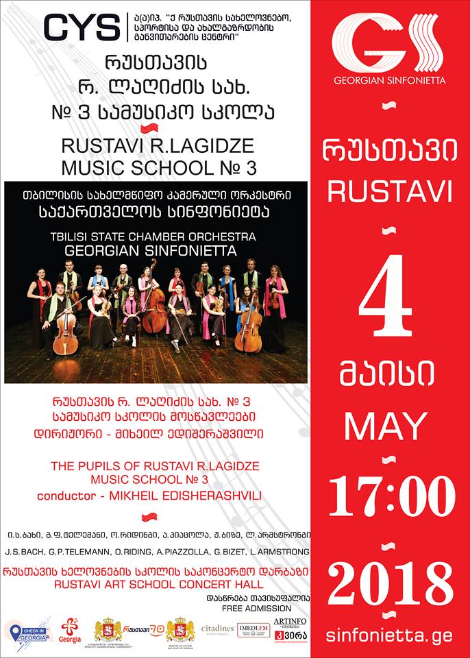 4 მაისს, 17:00 საათზე, პროექტ Check in Georgia-ს ფარგლებში, „საქართველოს სინფონიეტა“ დასკვნით კონცერტს ქალაქ რუსთავის ხელოვნების სკოლაში გამართავს.