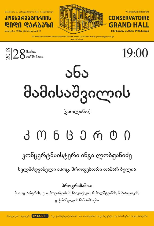 28 მაისს, 19:00 საათზე, კონსერვატორიის დიდ დარბაზში, ანა მამისაშვილის სავიოლიონო კონცერტი გაიმართება.