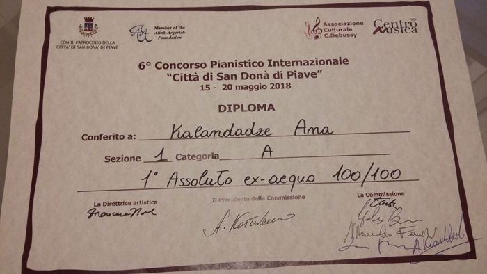 „იტალიაში, 15 – 20 მაისის ჩათვლით ჩატარდა ვენეციის საერთაშორისო მუსიკალური კონკურსი „San Dona’ di Piave“. ჩემს ანას ამ კონკურსზეც ჰქონდა ბრწყინვალე წარმატებები, მან დაიმსახურა უმაღლესი შეფასება ჟიურის წევრებისაგან, ანას შესრულება შეაფასეს ასი ქულიდან ასი ქულით და მიანიჭეს I „Assoluto ex-aequo“ პრემია.