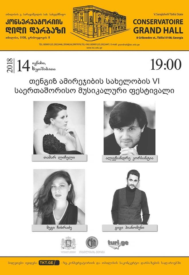 14 ივნისს, 19:00 საათზე, თბილისის ვანო სარაჯიშვილის სახელობის კონსერვატორიის დიდ დარბაზში, თენგიზ ამირეჯიბის სახელობის მე-6 საერთაშორისო მუსიკალური ფესტივალი გაიხსნება.