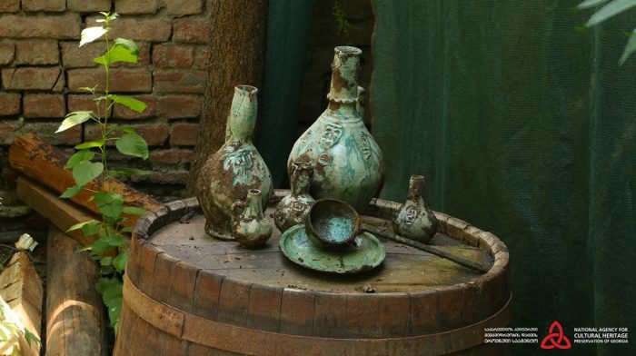 კერამიკული ნაწარმის გარდა ქვევრში დაფიქსირდა ასევე სპილენძის აზარფეშა,- გრძელტარიანი, ფართოპირიანი დიდი კოვზისებური ღვინის სასმისი და სპილენძის თეფში.