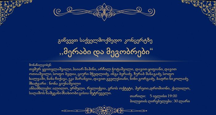 ასე რომ, 5 ივლისს, 19:00 საათზე, მერაბ ბერძენიშვილის სახელობის საერთაშორისო კულტურის ცენტრი „მუზა“ კომპოზიტორ მერაბ მამულაშვილის დასახმარებლად საქველმოქმედო კონცერტს უმასპინძლებს.