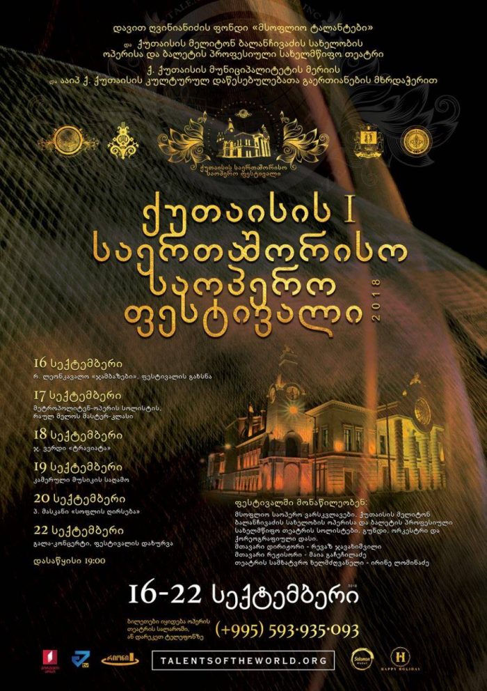 16-22 სექტემბერს, ქუთაისის მელიტონ ბალანჩივაძის სახელობის ოპერისა და ბალეტის პროფესიულ სახელმწიფო თეატრში ქუთაისის პირველი საერთაშორისო საოპერო ფესტივალი გაიმართება.