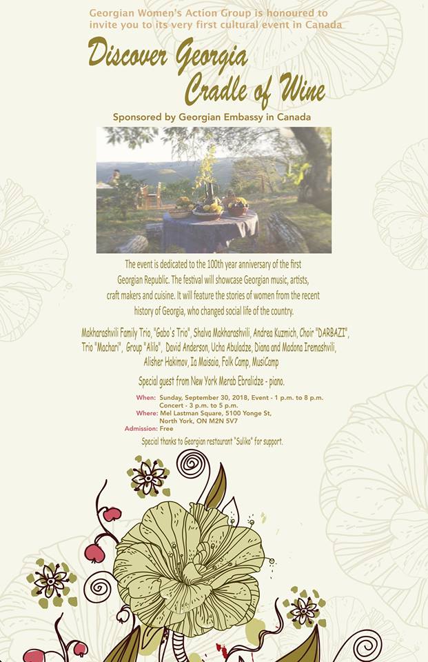 30 სექტემბერს, 13:00-20:00 საათზე, კანადის ქალაქ ტორონტოში ფესტივალი: „აღმოაჩინეთ საქართველო – ღვინის აკვანი“ გაიმართება, რომლის მიზანი ქართული კულტურის პოპულარიზაციაა.