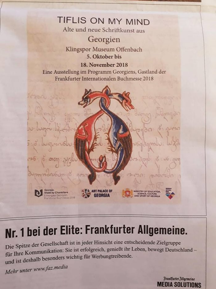 გერმანიის ერთ-ერთმა უდიდესმა გამოცემამ „Frankfurt spezial“-მა ხელოვნების სასახლის მიერ ოფენბახის შრიფტის მუზეუმში დაგეგმილი გამოფენის აფიშა დაბეჭდა, გაზეთი 250 ათასიანი ტირაჟით გამოდის და მთელს გერმანიაში ვრცელდება.