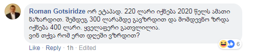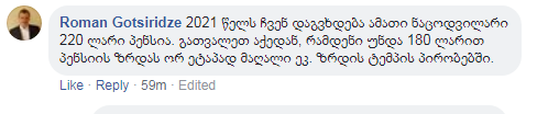 ”ვინ თქვა რომ ერთ დღეში ვზრდით? 2021 წელს ჩვენ დაგვხვდება ამათი ნაცოდვილარი 220 ლარი პენსია. გათვალეთ აქედან, რამდენი უნდა 180 ლარით პენსიის ზრდას ორ ეტაპად მაღალი ეკ. ზრდის ტემპის პირობებში”, – წერს რომან გოცირიძე.