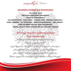 18 ნოემბერს, 16:30 საათზე,საქართველოს პარლამენტის ეროვნული ბიბლიოთეკის საგამოფენო დარბაზში პოლონეთის დამოუკიდებლობის 100 წლისთავისადმი მიძღვნილი კონცერტი გაიმართება.