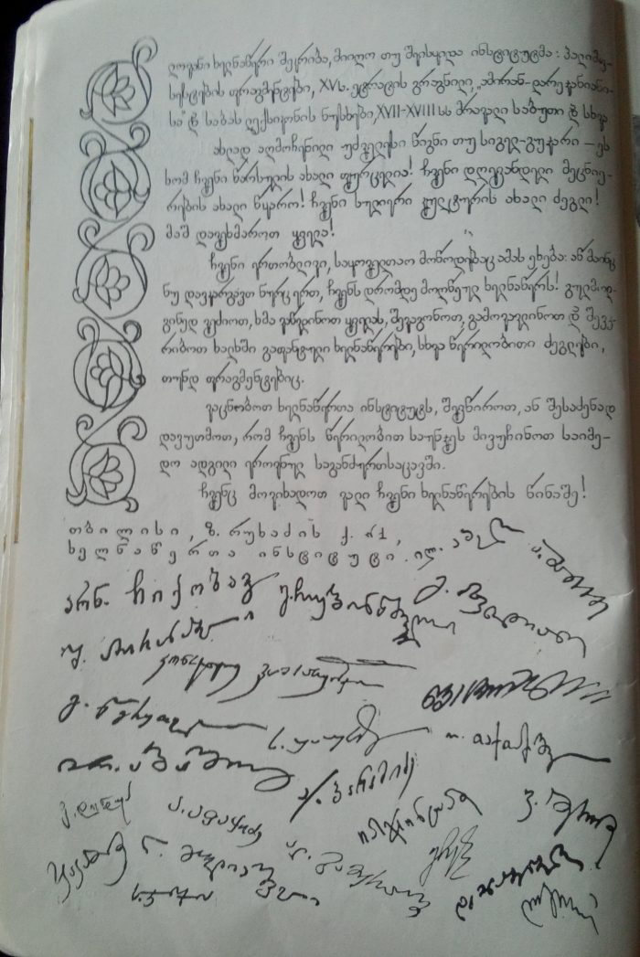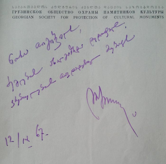ჟურნალის მე-10-11 ნომერში გამოქვეყნდა ზემოხსენებული ცნობილი მოღვაწეების მიმართვა – „ძეგლის ყველა მეგობარს“. ხელმოწერები იყო საჭირო. დამქონდა ტუში და ხელს ვაწერინებდი… მაშინ ჟურნალი ცინკოგრაფიულად, კლიშეებით იბეჭდებოდა, ხელმოწერები ზუსტად უნდა ჩამჯდარიყო ზომაში. მომცა ბატონმა ლევანმა საჭირო ფორმატის ქაღალდი და გამაფრთხილა, ყველა შეეცადოს, ისე განლაგდეს ხელმოწერები, გვერდზე არ გადავიდესო. მახსოვს ბატონ კონსტანტინე გამსახურდიასთან სტუმრობა, როგორც ბატონმა ლევანმა გამაფრთხილა, მეც ისე ავუხსენი საქმის ვითარება – შემომხედა და გაბრაზდა, – გადაეცი ბატონ ლევანს, რომ ნუ დამიწესებს ზღვარსო.