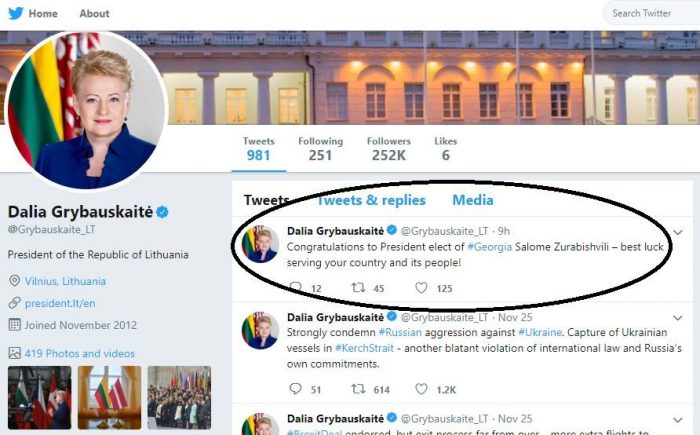 „ვულოცავ საქართველოს არჩეულ პრეზიდენტს, სალომე ზურაბიშვილს. წარმატებები ქვეყნისა და ხალხის სამსახურში“, – წერს „ტვიტერზე“ დალია გრიბაუსკაიტე.