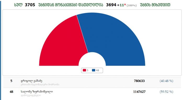 ცენტრალურმა საარჩევნო კომისიამ ხმების 100% დაითვალა. დათვლილი ბიულეტენების შედეგად „ქართული ოცნების“ მიერ მხარდაჭერილმა კანდიდატმა სალომე ზურაბიშვილმა 1 147 627 მიიღო (59.52 %), ხოლო „ნაციონალური მოძრაობის“ საპრეზიდენტო კანდიდატმა გრიგოლ ვაშაძემ – 780633 ხმა (40.48 %).