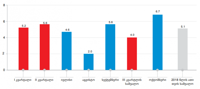 საქსტატის ინფორმაციით, 2018 წლის ოქტომბერში წინა წლის შესაბამის პერიოდთან შედარებით რეალური მთლიანი შიდა პროდუქტის (მშპ) ზრდის ტემპმა 6,7 პროცენტი შეადგინა, ხოლო 2018 წლის პირველი ათი თვის საშუალო რეალური ზრდა 5,1 პროცენტს შეადგენს.