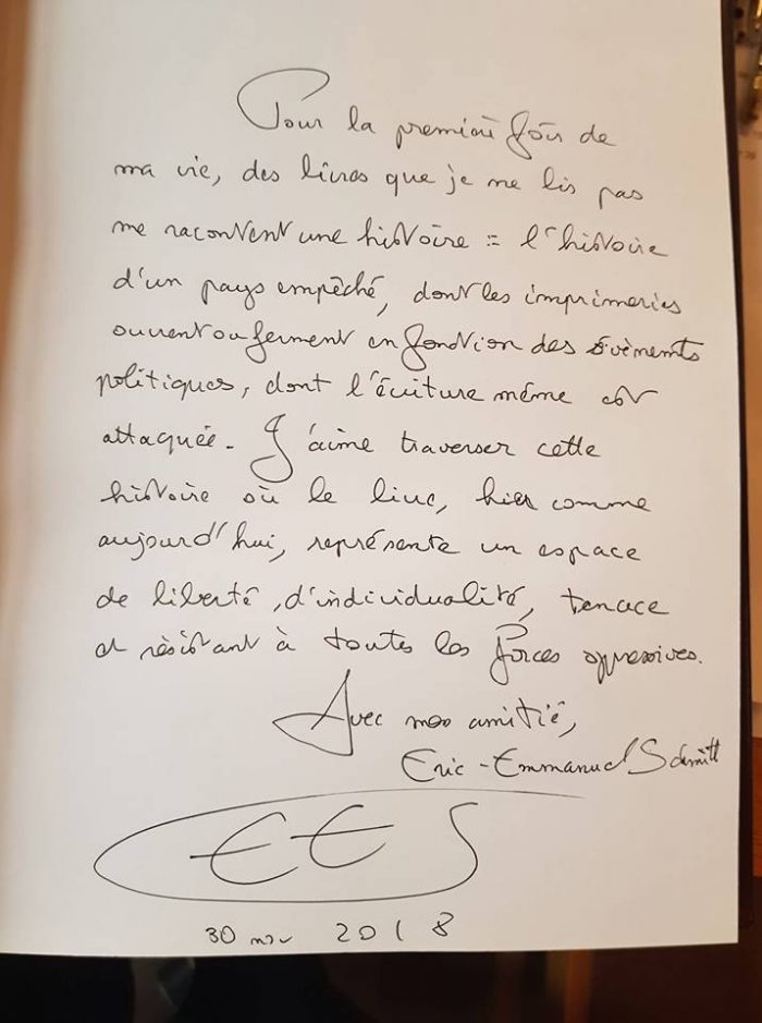 მწერალმა ეროვნული ბიბლიოთეკის შთაბეჭდილებათა წიგნში ჩანაწერი გააკეთა და მის ერთ-ერთ გამოცემაზე ავტოგრაფიც დატოვა. გამოცემა შმიტის ავტოგრაფით ეროვნული ბიბლიოთეკის იშვიათ გამოცემათა ფონდში დაიდებს ბინას.