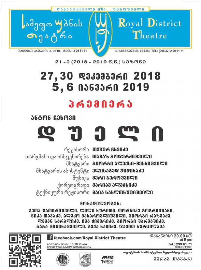 როგორც „კვირას“ სამეფო უბნის თეატრიდან აცნობეს, პირველად ქართული თეატრის სცენა ანტონ ჩეხოვის „დუელს” დაეთმობა. სპექტაკლს თემურ ჩხეიძე დადგამს.