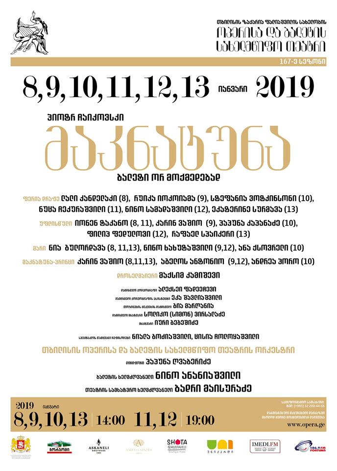 8, 9, 10, 13 იანვარს, 14:00 საათზე, 11, და 12 იანვარს, 19:00 საათზე, ოპერისა და ბალეტის თეატრში ბალეტი „მაკნატუნა“ გაიმართება.