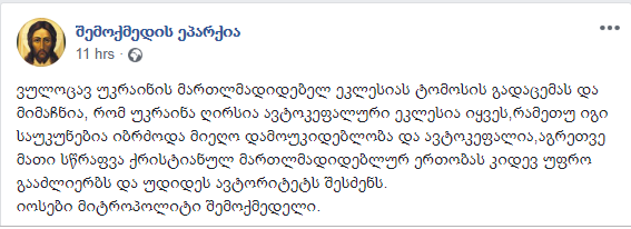 “ვულოცავ უკრაინის მართლმადიდებელ ეკლესიას ტომოსის გადაცემას და მიმაჩნია, რომ უკრაინა ღირსია ავტოკეფალური ეკლესია იყოს,რამეთუ იგი საუკუნეებია იბრძოდა მიეღო დამოუკიდებლობა და ავტოკეფალია, აგრეთვე მათი სწრაფვა ქრისტიანულ მართლმადიდებლურ ერთობას კიდევ უფრო გააძლიერებს და უდიდეს ავტორიტეტს შესძენს”, – აღნიშნავს მეუფე იოსები.