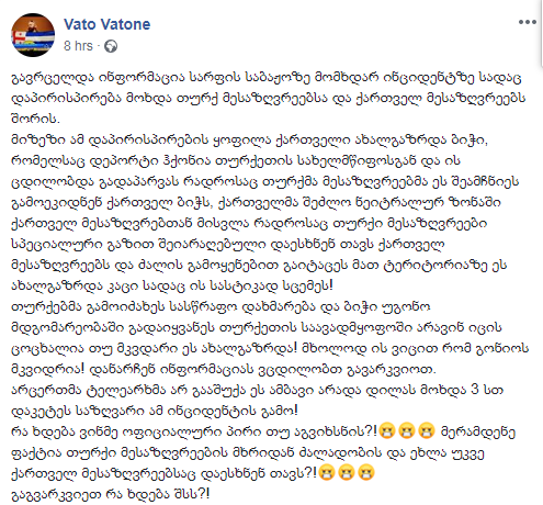 “გავრცელდა ინფორმაცია სარფის საბაჟოზე მომხდარ ინციდენტზე სადაც დაპირისპირება მოხდა თურქ მესაზღვრეებსა და ქართველ მესაზღვრეებს შორის.