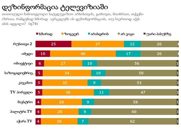 NDI-ს მიერ გამოკითხულთა 25% ამბობს, რომ „რუსთავი 2“ ხშირად ავრცელებს დეზინფორმაციას, 37% ფიქრობს, რომ ზოგჯერ ავრცელებს დეზინფორმაციას; 12%-ის აზრით კი, „რუსთავი 2“ არასდროს ავრცელებს დეზინფორმაციას; 26%-მა არ იცის, 1%-მა კი უარი თქვა პასუხზე, ამის შესახებ ეროვნულ დემოკრატიული ინსტიტუტის კვლევაშია ნათქვამი.
