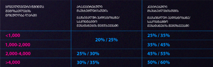 ანუ განისაზღვრა თვეში მაქსიმუმ რა თანხის გადახდა შეგიძლია ვალდებულებებში შენი შემოსავლის გათვალისწინებით. სიტყვაზე, თუ შენი თვიური შემოსავალი 1000 ლარზე ნაკლებია და უცხოურ ვალუტაში გაქვს რამე სესხი, თვეში შეიძლება ამ შემოსავლის მხოლოდ 25% მიმართო სესხის დასაფარად, ხოლო თუ შენი შემოსავალიც და სესხიც ერთსა და იმავე ვალუტაშია, მაშინ შემოსავლის მაქსიმუმ 35%-ს სესხის მიმართავ ყოველთვიურ გადასახადზე. ასევე, შემოსავალს გამოკლებული სესხის ყოველთვიური გადასახადი აუცილებლად უნდა აღემატებოდეს საარსებო მინიმუმს. ასე გამოიყურება შემოსავლების მიხედვით განსაზღვრული ყოველთვიური გადახდების პროცენტები.