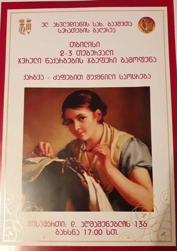 2-3 თებერვალს, 17:00 საათზე, ელენე ახვლედიანის სახელობის სახვითი ხელოვნების მუზეუმში ჯვრული ნაქარგების ჯგუფური გამოფენა – „ქარგვა-ძაფებით შექმნილი საოცრება!“ გაიმართება.