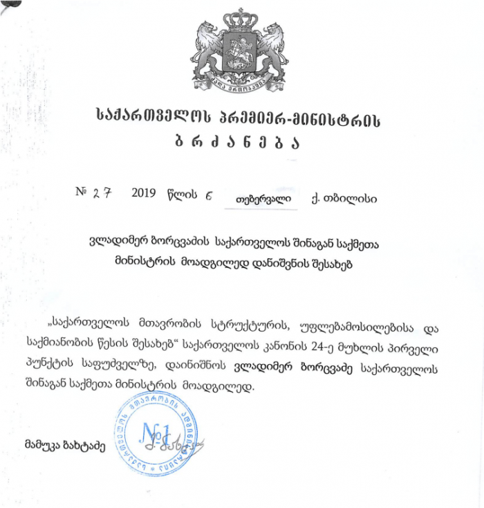 აღსანიშნავია, რომ ამავე გვერდზე გამოქვეყნებულია ინფორმაცია, რომელიც 6 თებერვლით არის დათარიღებული – საქართველოს პრემიერ-მინისტრის ბრძანებით, შინაგან საქმეთა მინისტრის მოადგილედ სამინისტროს ცენტრალური კრიმინალური პოლიციის დეპარტამენტის დირექტორი, პოლიციის ვიცე-პოლკოვნიკი, ვლადიმერ ბორცვაძე დაინიშნა.