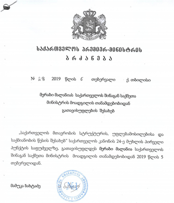 მერაბ მალანია შინაგან საქმეთა მინისტრის მოადგილის პოსტიდან გათავისუფლდა, – ამის შესახებ პრემიერ-მინისტრის ბრძანების ტექსტშია ნათქვამი, რომელიც მთავრობის ადმინისტრაციის ოფიციალურ გვერდზე გამოქვეყნდა.