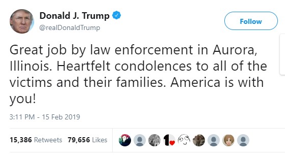 “ავრორაში სამართალდამცველებმა შესანიშნავად იმუშავეს, ილინოისი გულწრფელად თანაუგრძნობს გარდაცვლილთა ოჯახებს, ამერიკა თქვენთან არის!”, – ნათქვამია ტრამპის ტვ