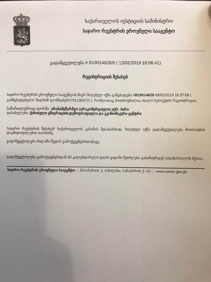არასამთავრობო ორგანიზაცია “ქართული ემიგრაციის, დემოგრაფიული და ეკონომიკური ცენტრი”, რომელიც ახალგაზრდებს ოჯახების შექმნაში ფინანსურად დაეხმარება, საჯარო რეესტრმა უკვე დაარეგისტრირა.