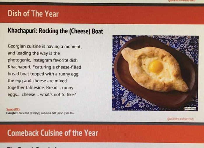 რესტორნისა და მასპინძლობის სფეროს ამერიკულმა კომპანიამ Af&Co 2019 წლის ტენდენციები გამოაქვეყნა. ინფორმაციას აჭარის ტურიზმისა და კურორტების დეპარტამენტი ავრცელებს. Af&Co-მ ქართული საჭმელი წლის სამზარეულოდ, აჭარული ხაჭაპური კი წლის კერძად დაასახელა.