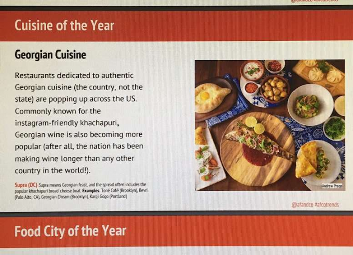 ცნობისათვის, af&co ტურიზმის ინდუსტრიის წამყვანი საკონსულტაციო კოპმანიაა, რომელიც რესტორნების, საკვებისა და სასმელის, მასპინძლობის მარკეტინგის უმთავრეს ტენდენციებს პერიოდულად ასახელებს.