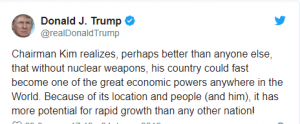 პრეზიდენტი წერს, რომ ეს ქვეყანა გაცილებით დიდ პოტენციალს ფლობს სწრაფი ზრდისთვის ვიდრე სხვა ნებისმიერი ქვეყანა. მაგრამ ამ განცხადებამდე რამდენიმე საათით ადრეა ამერიკის სახელმწიფო მდივანმა მაიკ პომპეომ განაცხადა, რომ ფხენიანი ამერიკისთვის დღემდე ბირთვულ საფრთხეს წარმოადგენს.