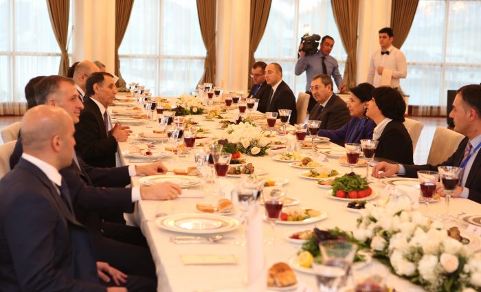 საქართველოს პრეზიდენტის სახელმწიფო დელეგაციის შემადგენობაში შედიან: საქართველოს ეკონომიკისა და მდგრადი განვითარების მინისტრი გიორგი ქობულია, პარლამენტის თავმჯდომარის მოადგილე, აზერბაიჯანის რესპუბლიკის პარლამენტთან მეგობრობის ჯგუფის ხელმძღვანელი ზვიად ძიძიგური, პარლამენტის დიასპორისა და კავკასიის საკითხთა კომიტეტის თავმჯდომარე, აზერბაიჯანის რესპუბლიკის პარლამენტთან მეგობრობის ჯგუფის წევრი ზვიად კვაჭანტირაძე, პარლამენტის ევროპასთან ინტეგრაციის კომიტეტის წევრი, აზერბაიჯანის რესპუბლიკის პარლამენტთან მეგობრობის ჯგუფის წევრი გიორგი მოსიძე, პარლამენტის განათლების მეცნიერებისა და კულტურის კომიტეტის წევრი, აზერბაიჯანის რესპუბლიკის პარლამენტთან მეგობრობის ჯგუფის წევრი ნინო წილოსანი, პარლამენტის ადამიანის უფლებათა დაცვისა და სამოქალაქო ინტეგრაციის კომიტეტის წევრი ადა მარშანია, საქართველოს პრეზიდენტის ადმინისტრაციის უფროსი ლაშა ჟვანია, საქართველოს საგარეო საქმეთა მინისტრის მოადგილე მიხეილ ნინუა, საქართველოს საგანგებო და სრულუფლებიანი ელჩი აზერბაიჯანის რესპუბლიკაში ზურაბ პატარაძე და პრეზიდენტის ადმინისტრაციის უფროსის პირველი მოადგილე ქეთევან მახარაშვილი.