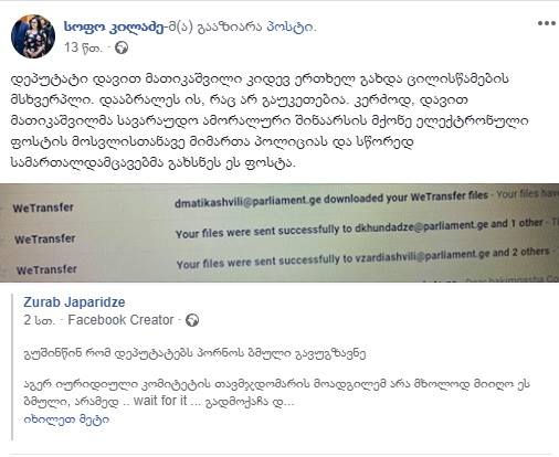 შეგახსენებთ, რომ გირჩის” ერთ-ერთმა ლიდერმა, ზურაბ ჯაფარიძემ, დღეს “ფეისბუქის” პირად გვერდზე დაწერა, რომ მან რამდენიმე დეპუტატს “პორნო” გაუგზავნა, იურიდიული კომიტეტის თავმჯდომარის მოადგილემ კი, ოფიციალურ, პარლამენტის ელ. ფოსტის მისამართზე მიღებული გადმოწერა და შემდეგ უყურა.