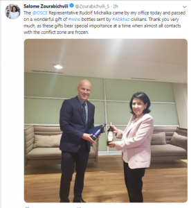 „ამ საჩუქრებს განსაკუთრებული მნიშვნელობა აქვთ მაშინ, როდესაც თითქმის ყველა კონტაქტი კონფლიქტის ზონასთან გაყინულია“, – ამის შესახებ საქართველოს პრეზიდენტი სალომე ზურაბიშვილი წერს და ინფორმაციას ასაჯაროვებს. როგორც ირკვევა, საქართველოს პრეზიდენტს ეუთო-ს წარმომადგენელმა აფხაზების მიერ გამოგზავნილი ღვინო გადასცა.