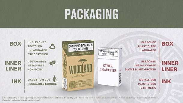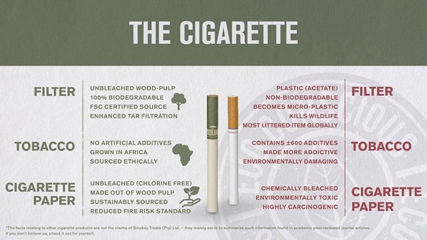 ეკოსიგარეტის ფილტრი ხის მერქნისგან არის დამზადებული. კომპანია “Smokey Treats”-ის დამფუძნებლების თქმით, გარკვეული დროის შემდეგ, მოწეული სიგარეტის “ბიჩოკისგან” გარემოში კვალიც კი არ დარჩება. შემქმნელების თქმით, თამბაქო არავითარ დანამატს შეიცავს. მუყაოს ყუთზე დატანილი წარწერაც კი ეკოლოგიურია – მელანი დამზადებულია სოიოსგან. კომპანიის დაპირებით, ეკოსიგარეტის გაყიდვებით მიღებული მოგება სამხრეთ აფრიკაში ტყის საფარის აღსადგენად იქნება მიმართული.