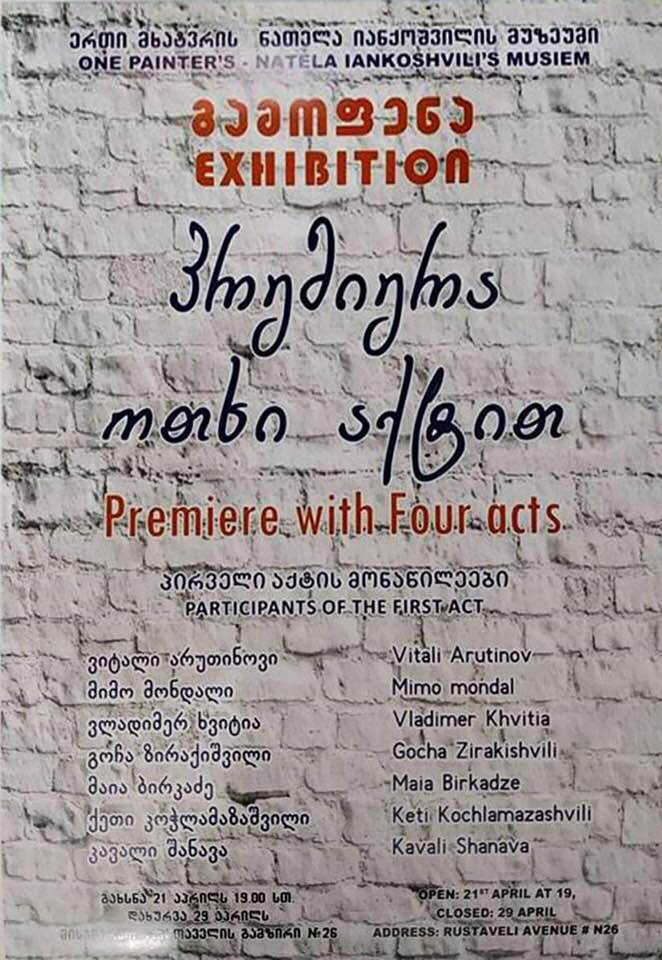 21 აპრილს, 19:00 საათზე, ნათელა იანქოშვილის მუზეუმში, გამოფენა – „პრემიერა ოთხი აქტით“ გაიხსნება.