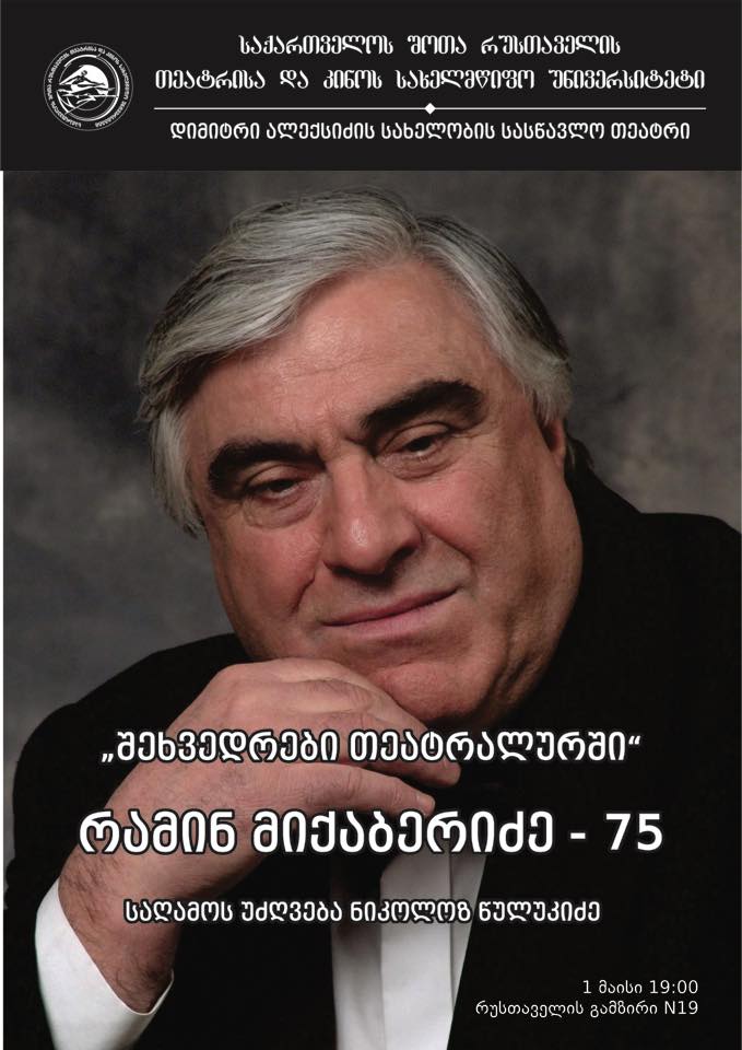 1 მაისს, 19 საათზე, თეატრისა და კინოს სახელმწიფო უნივერსიტეტის დიმიტრი ალექსიძის სახელობის თეატრში, გაიმართება შეხვედრა საქართველოს დამსახურებულ არტისტთან, თბილისის საპატიო მოქალაქესთან, ანსამბლ „მართვეს“ ერთ-ერთ დამაარსებელთან, ჰამლეტ გონაშვილის პარტნიორთან და ანსამბლ „რუსთავის“ ერთ-ერთ გამორჩეულ სოლისტთან რამინ მიქაბერიძესთან.