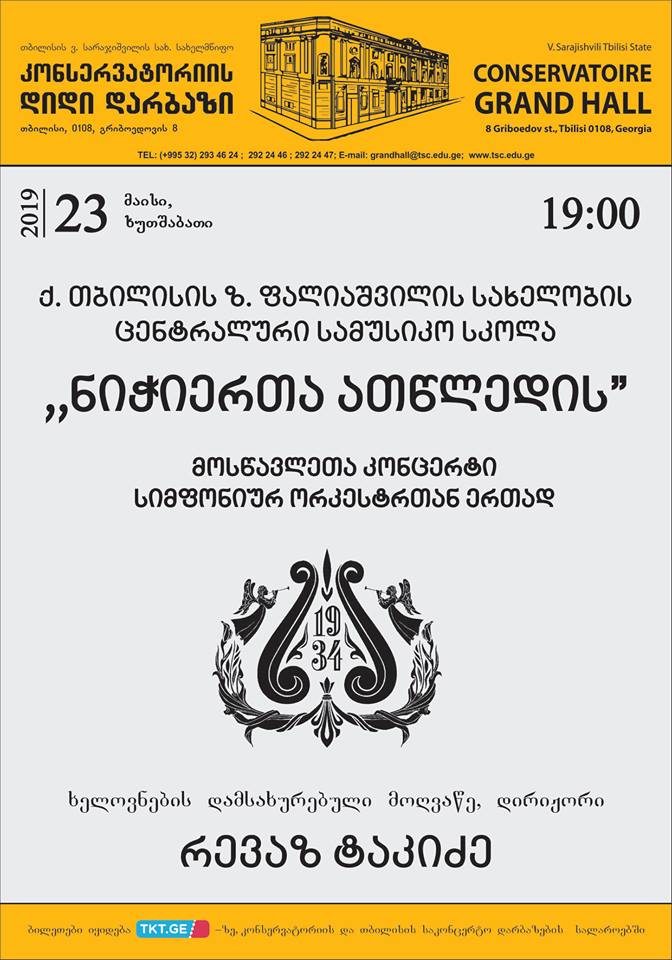 23 მაისს, 19:00 საათზე, ვ. სარაჯიშვილის სახელობის კონსერვატორიის დიდ დარბაზში, თბილისის ზ. ფალიაშვილის სახელობის ცენტრალური სამუსიკო სკოლა ,,ნიჭიერთა ათწლედის“ მოსწავლეთა კონცერტი სიმფონიურ ორკესტრთან ერთად გაიმართება.