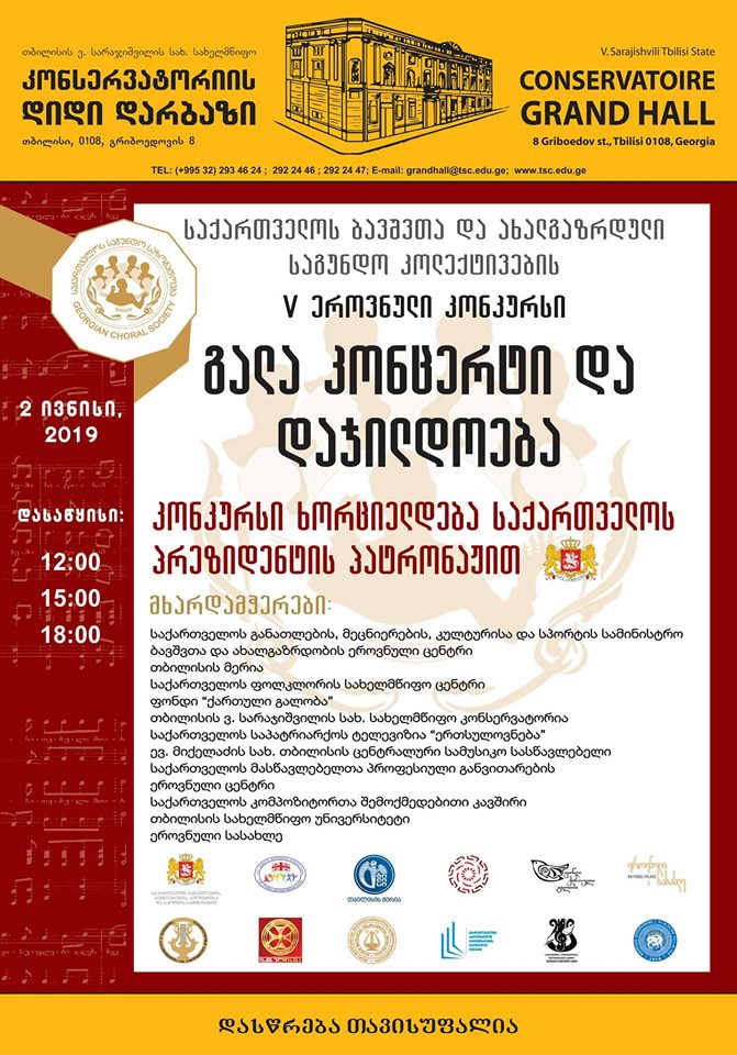 2 ივნისს, 12:00 – 20:00 საათზე, თბილისის სახელმწიფო კონსერვატორიაში, საქართველოს ბავშვთა და ახალგაზრდული საგუნდო კოლექტივების V კონკურსის გალა კონცერტი და დაჯილდოება გაიმართება.