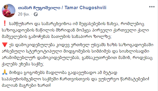 „სამწუხარო და სამარცხვინოა იმ შეფასებების ნახვა, რომლებიც საზოგადოების ნაწილის მხრიდან მოჰყვა პირველი ქართველი ქალი მაშველების გამოჩენას ბათუმის სანაპირო ზოლზე“ – ამ სიტყვებით ეხმაურება პარლამენტის ვიცე-სპიკერი თამარ ჩუგოშვილი ქალი მაშველების ირგვლივ სოციალურ ქსელში განვითარებულ მოვლენებს.