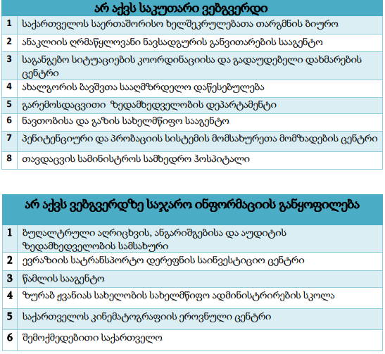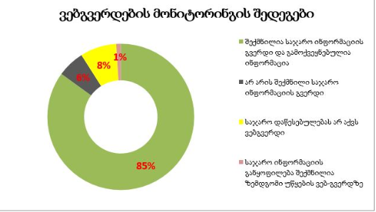 ანალიზის შედეგად დადგინდა რომ, 100 საჯარო დაწესებულებიდან, 8 უწყებას საერთოდ არ ჰქონდა საკუთარი ვებგვერდი, ხოლო 6 უწყების შემთხვევაში ვებგვერდზე არ იყო შექმნილი საჯარო ინფორმაციის განყოფილება . ერთ უწყებას, კი, საერთოდ არ გააჩნდა საკუთარი ვებგვერდი, თუმცა საჯარო ინფორმაციის განყოფილება შექმნილი იყო მისი ზემდგომი უწყების ელექტრონულ რესურსზე. დანარჩენი 85 საჯარო დაწესებულების ვებგვერდზე შექმნილი იყო საჯარო ინფორმაციის განყოფილება და პროაქტიულად იყო გამოქვეყნებული ინფორმაცია.