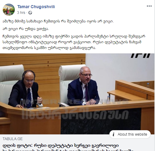 მას არცთუ ისე მეგობრულად დახვდნენ საქართველოში. უკვე მეორე დღეა, როგორც ხელისუფლების მაღალჩინოსნებთან შეხვედრები, ისე ასამბლეაც მოსახლეობისა და ოპოზიციის საპროტესტო აქციების ფონზე მიმდინარეობს. დღეს საქართველოს პარლამენტში მომხდარმა ფაქტმა კი ქართული საზოგადოების ისედაც ნეგატიური დამოკიდებულება რუსი დეპუტატის ქვეყანაში ვიზიტის გამო, უფრო მეტად გაამწვავა და მანამდე კეთილგანწყობილი მთავრობაც კი შეაშფოთა.