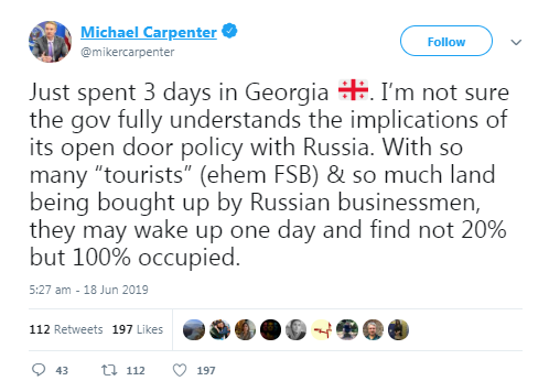 მართლდება თუ არა რუსეთის საკითხებზე მომუშავე ამერიკელი ექსპერტისა და აშშ-ის თავდაცვის მდივნის ყოფილი თანაშემწის – მაიკლ კარპენტერის ვარაუდი?! კარპენტერმა გუშინ ტვიტერის ოფიციალურ გვერდზე დაწერა, რომ “საქართველოს ხელისუფლება ბოლომდე აცნობიერებს რუსეთთან ღია პოლიტიკის შედეგებს” და ისინი ერთხელაც აღმოაჩენენ, რომ ოკუპირებულია არა 20%, არამედ 100%.