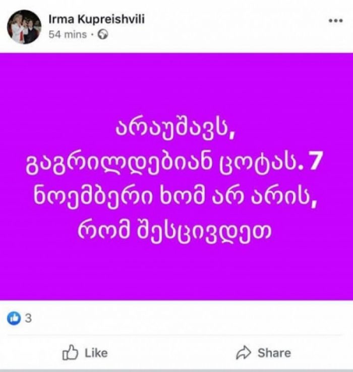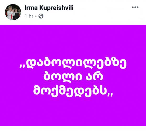 ძალიან რთული წასაკითხია ეს ყველაფერი და სწორედ ამიტომ წავშალე გვერდი საერთოდ იმიტომ, რომ აბსოლუტურად სამართლიანი აგრესია მოდის საზოგადოებისგან და სანამ განვუმარტავ მათ და ვეტყვი, იქ რა ტექნიკურ პრობლემას ჰქონდა ადგილი, ჩემთვისაც ძალიან რთულია ემოციურად ეს ყველაფერი. ამიტომ მივიჩნიე საჭიროდ, რომ ყველაფერი წამეშალა“, – აღნიშნა ირმა კუპრეიშვილმა ჩვენთან საუბარში.