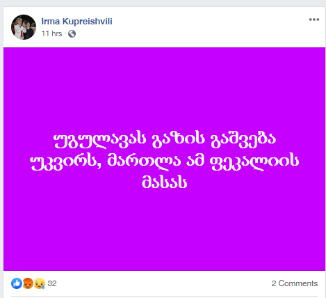 ირმა კუპრეიშვილის „ფეისბუქგვერდზე“ სხვა სტატუსებიც განთავსდა: „უგულავას გაზის გაშვება უკვირს, მართლა ამ ფეკალიის მასას“; „”დაბოლილებზე ბოლი არ მოქმედებს”.